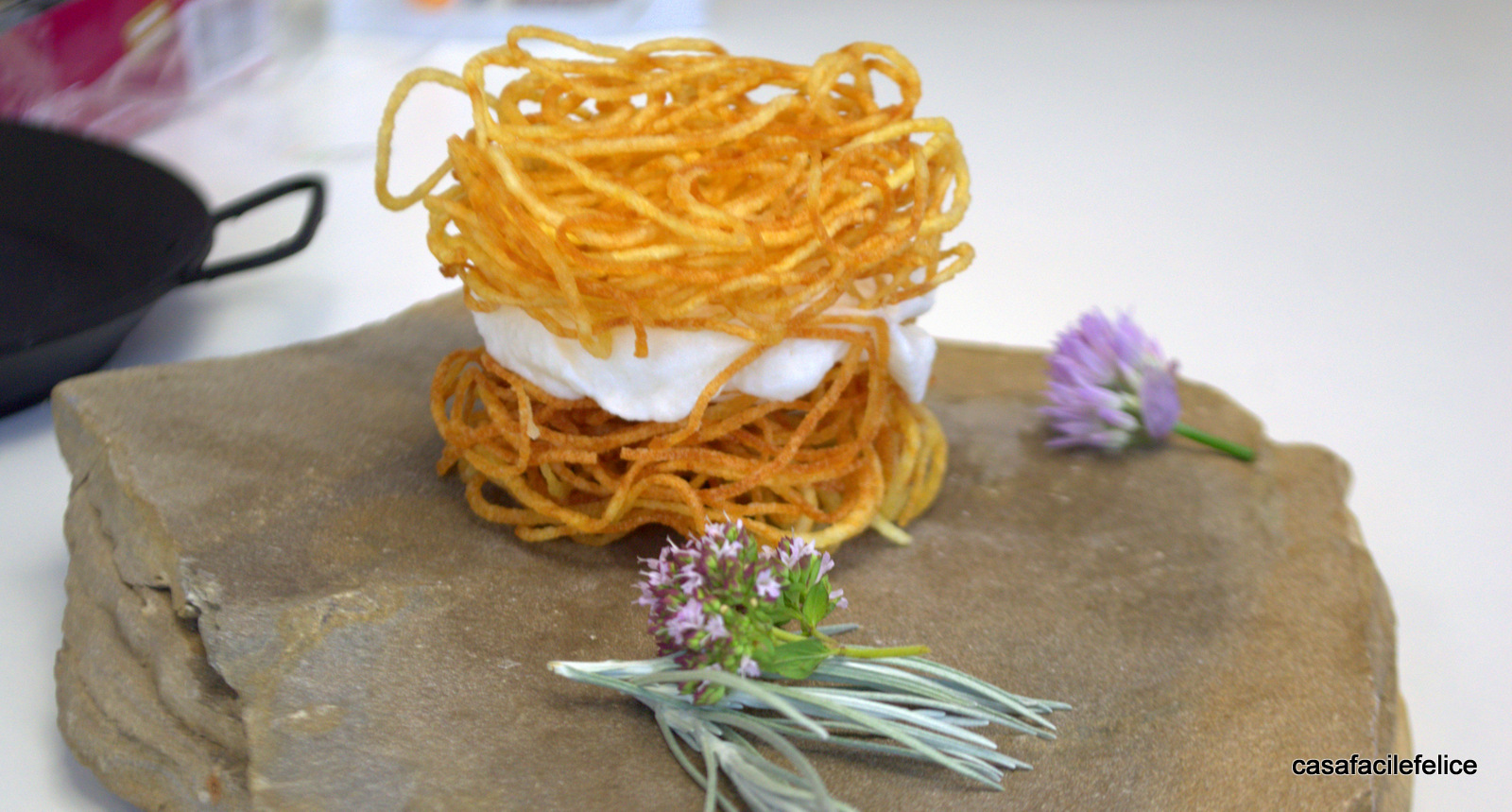 Dimenticate che si tratta di patate, giacché questa preparazione è perfetta per ben figurare ed arricchire la gamma degli antipasti con la sua croccantezza che risulta decisa e sopratutto asciutta, sapientemente bilanciata dalla delicatezza della spuma che infiltrandosi negli spaghetti di patate ne esalta il sapore.
