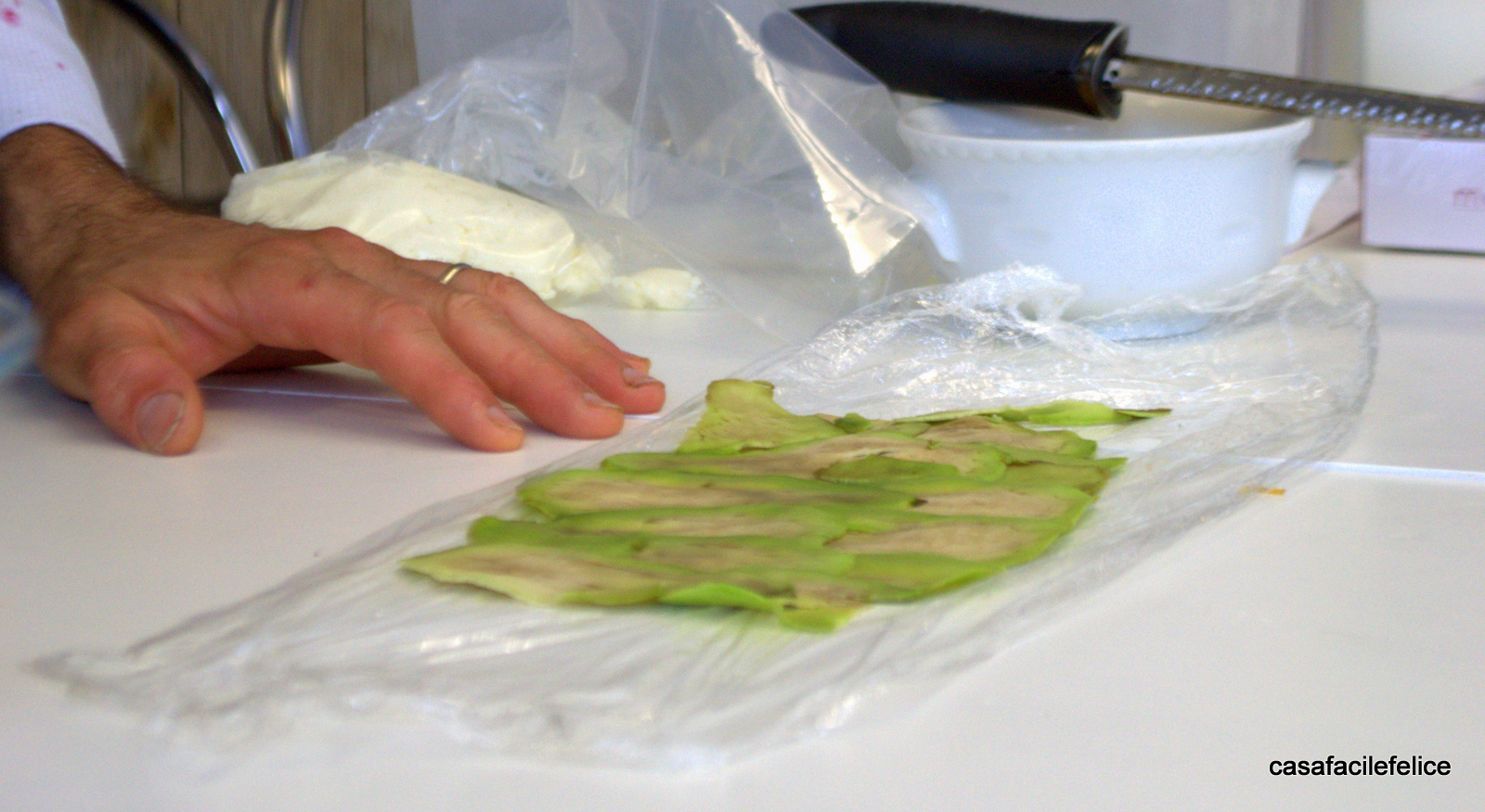 Il cannellone legato stretto nella pellicola per alimenti deve essere lasciato raffreddare per qualche tempo in frigo,