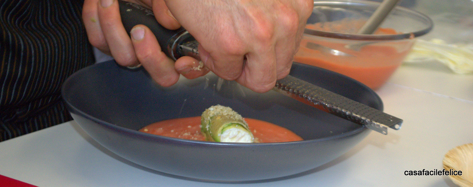 Il tutto si adagia su un letto cremoso di rosso gazpacho ottenuto frullando sapientemente pomodori rossi e aromi soliti quali sedano, cipolla rossa, cetrioli, peperoni, oltre a cubetti di ghiaccio; la crema densa va salata, condita con un goccio d’olio e filtrata attraverso un colino stretto che elimini tutti i semi e i filamenti così da non disturbare il palato e lasciare le papille gustative pulite, fresche e pronte per ricevere un nuovo bocconcino.