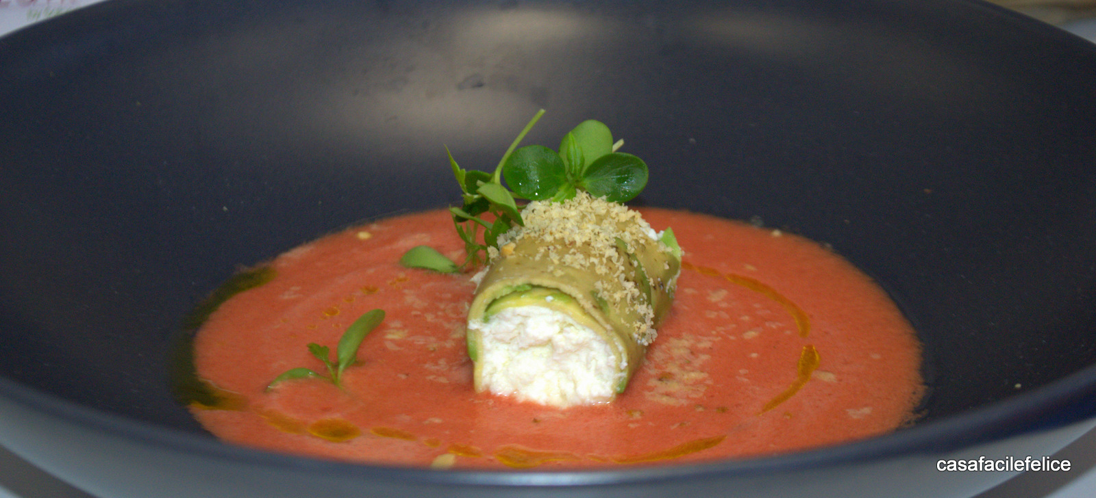 Cannellone di avocado su letto di gazpacho.
