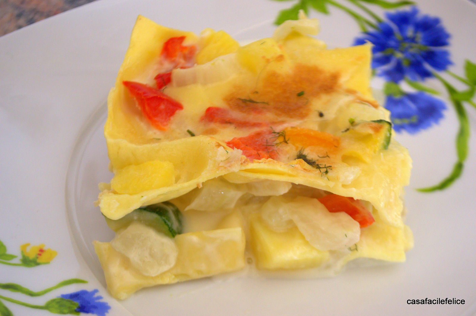 Ricetta semplice con verdure che possono essere cambiate secondo la necessità o il bisogno; utile anche per riciclare eventuali rimanenze. La bechamel può essere sostituita dalla blanquette ottenuta con il brodo di cottura delle verdure stesse stemperando 2 cucchiai di farina per 500 ml di liquido e aggiustando di sale e pepe a piacere.