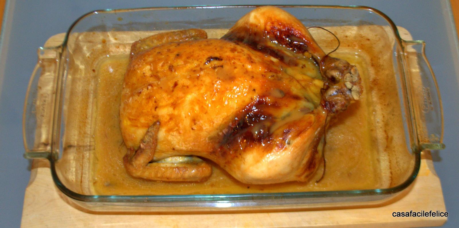 Pulite il pollo, lavatelo bene dentro e fuori e asciugatelo; profumatelo internamente con gli aromi tritati.