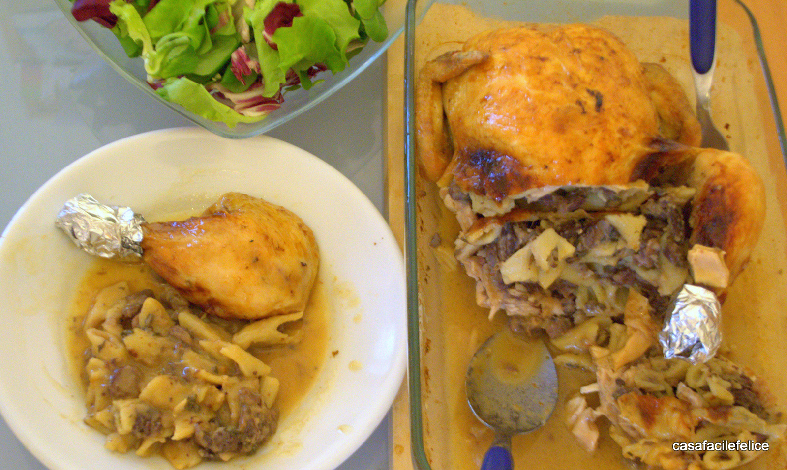 Servite il pollo e un po di ripieno, dopo aver irrorato tutto con un po di fondo di cottura.