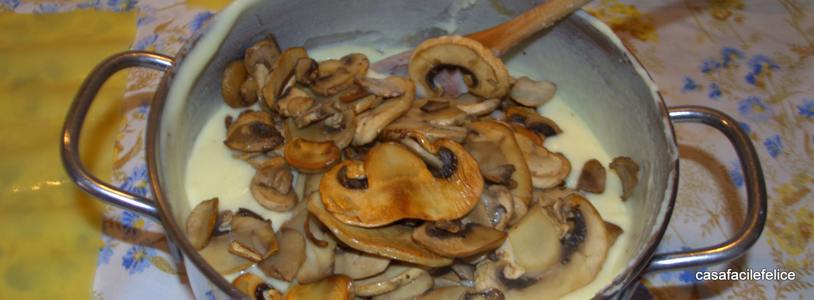 aggiustate di sale  solo alla fine e aggiungeteli ad una parte della besciamella, cannelloni funghi e speck