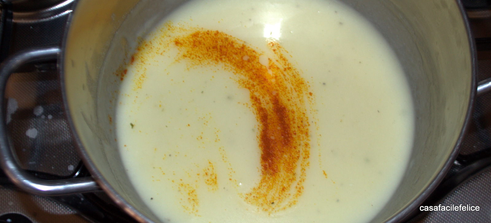 Besciamella. Fate sciogliere il burro in un pentolino, aggiungete la farina e quando è leggermente tostata aggiungete il latte scaldato, poco alla volta, mescolando continuamente per evitare grumi. Prima della fine della cottura aggiungete lo zafferano, sale e pepe.besciamella