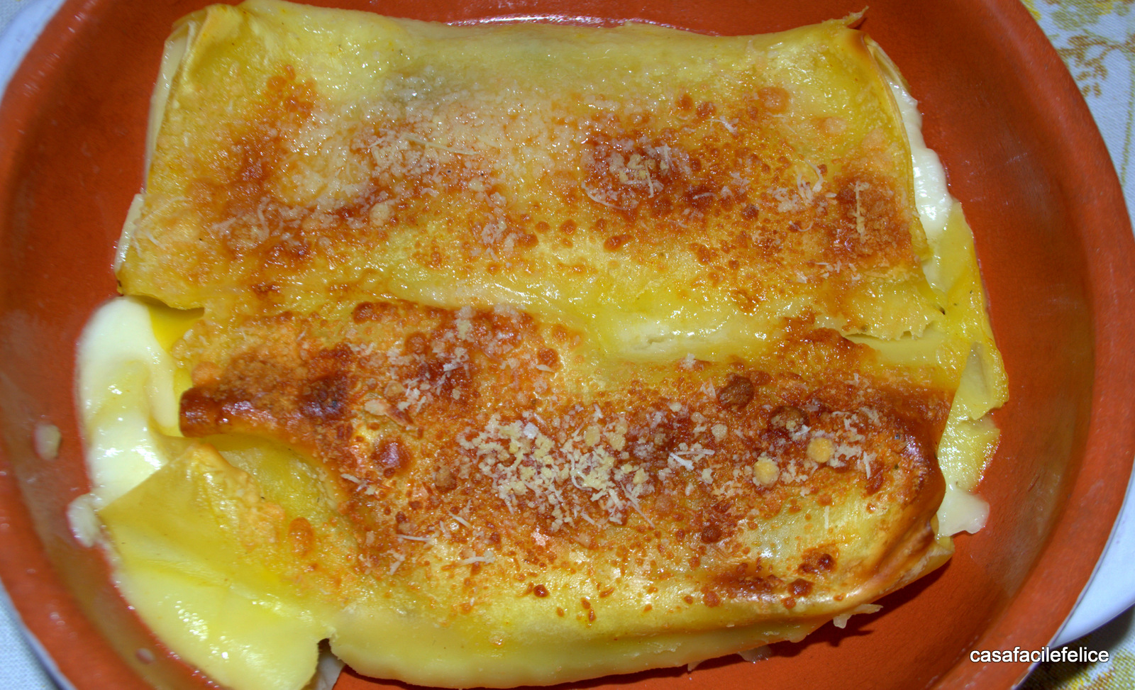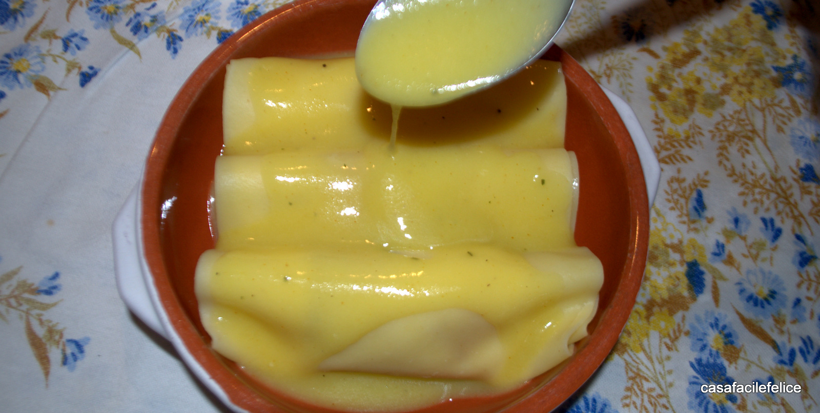 Ricetta  ricca e gustosa, adatta ai giorni di festa; i cannelloni così preparati possono essere fatti il giorno prima e lasciati in frigo. Togliete dal frigo 30 minuti prima di cuocerli.  Vanno cotti in forno caldo e lasciati riposare qualche minuto prima di servirli.