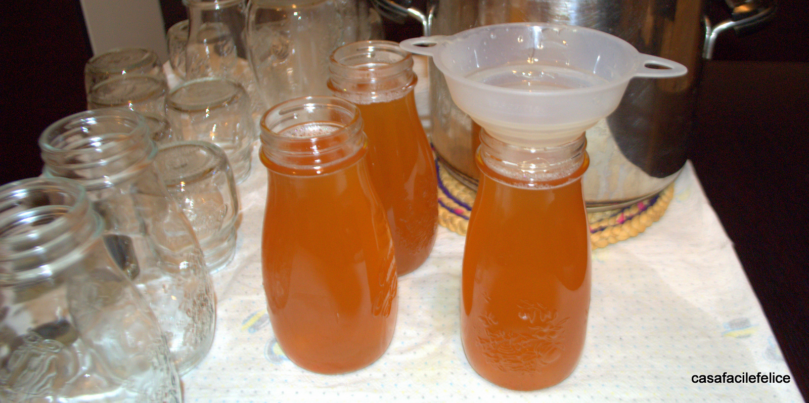 portate a bollore a fuoco dolce e lasciate bollire 10 minuti. Se il liquido supera il litro e mezzo meglio allungare i tempi di bollitura. Schiumate attentamente per eliminare tutte le impurità. Quando sarà trascorso il tempo, lasciate intiepidire e versate nelle bottiglie; sciroppo di uva fragola bianca