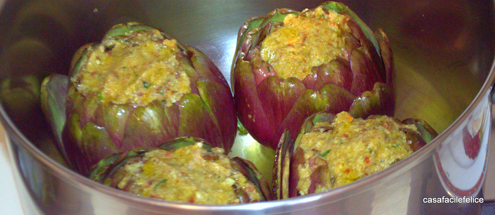 Carciofi ripieni di pane raffermo, uova e formaggio come si preparavano una volta, insaporiti da un pezzettino di salamino piccante tritato che da più gusto al ripieno.