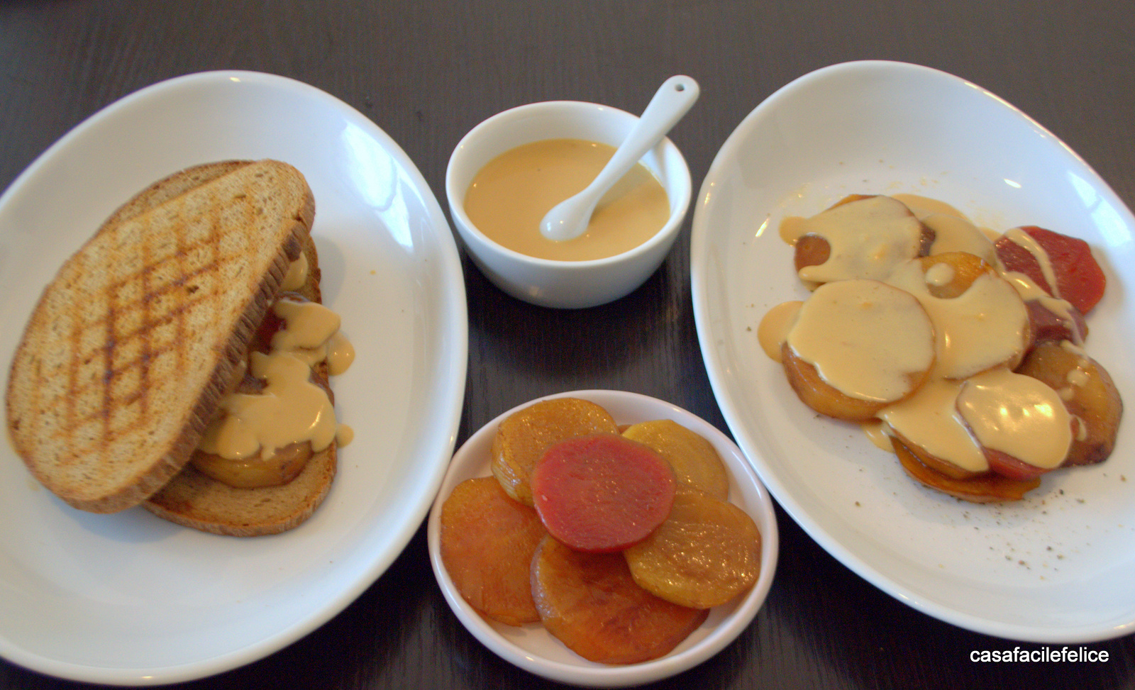 mettete la fetta sul piatto di portata e distribuite le fette di rapa, versate sopra la crema di soia e chiudete il panino con un’altra fetta di pane.