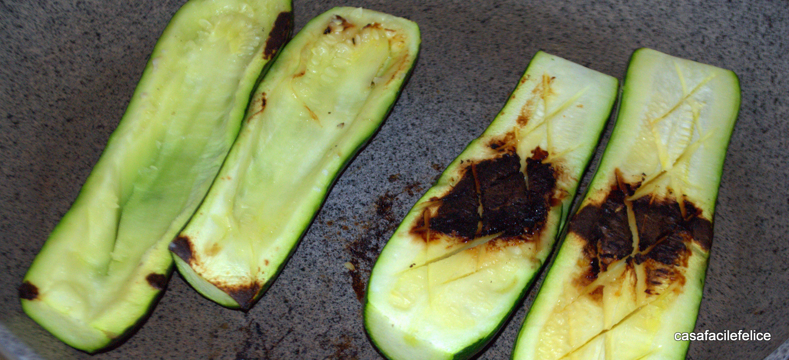 Lavate e tagliate a metà le zucchine nel senso della lunghezza, incidete la polpa cuocetele in padella con un po di olio per 10 minuti; scavate la polpa cotta e mettetela in parte; lasciate cuocere le zucchine sul dorso per altri cinque minuti.