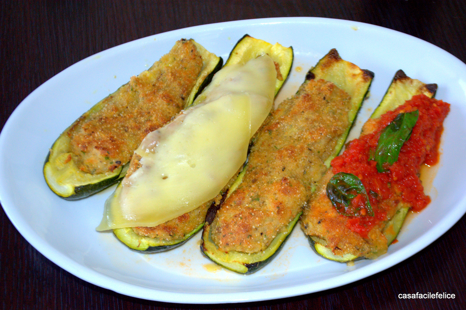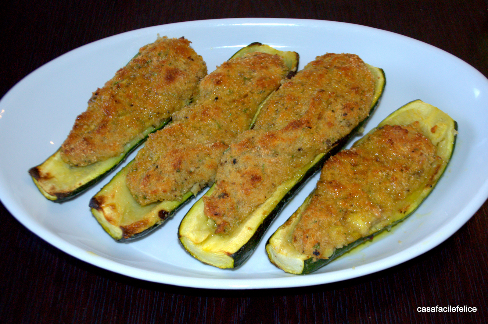 Riempite le zucchine e allineatele in una pirofila unta con qualche cucchiaiata di olio; spolverate con pane grattugiato e un filo di olio, Cuocete nel forno caldo a 190° per 10 minuti e sotto il grill per altri 5 minuti.