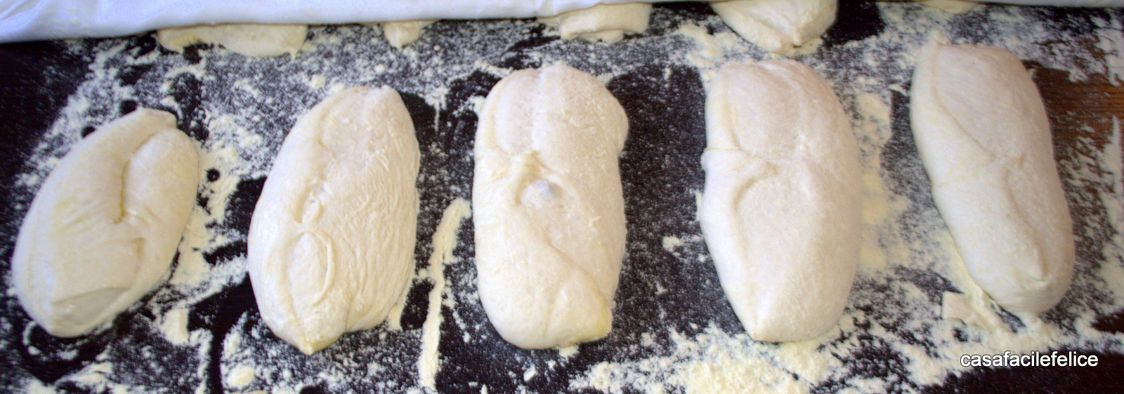 Spolverate con la farina di semola il piano di lavoro e versate l’impasto, tagliatelo in due pezzi e da ognuno ritagliate tanti panetti lunghi 18/20 centimetri e larghi 8/10 centimetri.