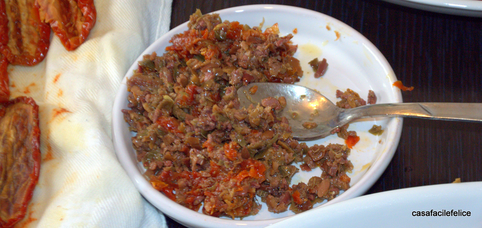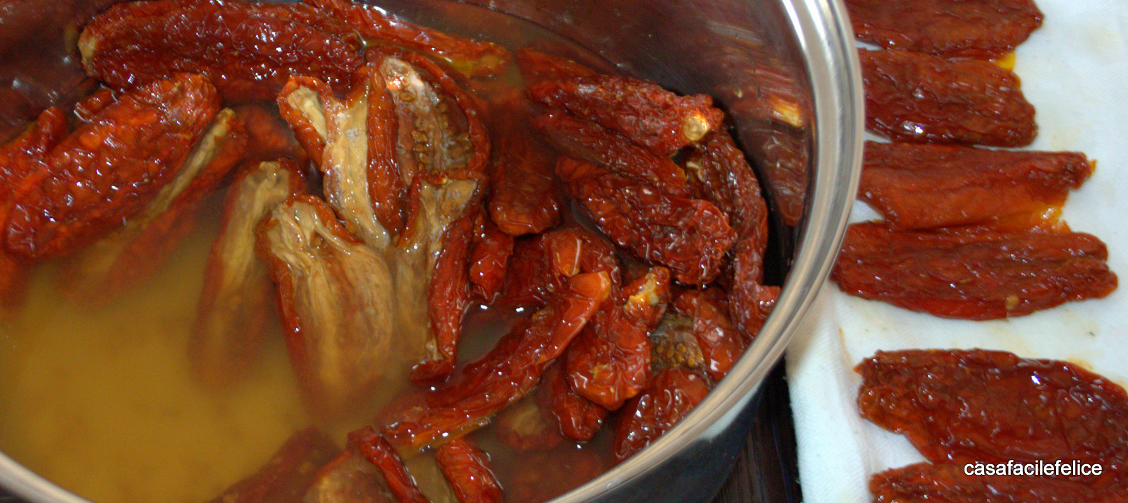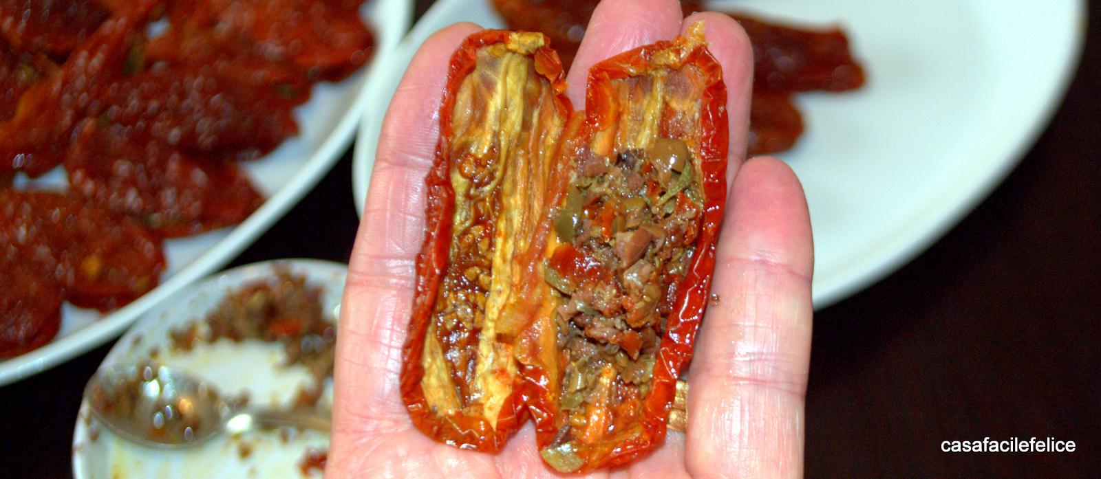 Antonietta 02/08/2017I pomodori secchi si prestano ad una lunga conservazione, oltre che con la salatura e l’essiccazione al sole possono essere conservati anche sottolio dopo aver subito la lavatura con aceto, necessaria ad abbattere il ph e permettere di raddoppiare i tempi di conservazione. Qui di seguito è disponibile il video della preparazione dei pomodori secchi farciti e conservati sottolio e per coloro che non amano i video, sono disponibili le foto per eseguire la preparazione momento per momento, per avere una ricettina deliziosa che sorprende per la bontà e i profumi che nascondono le fette di pomodori secchi che consentono facilmente la farcitura quando sono ancora attaccate. Consiglio la macinatura degli ingredienti per avere un prodotto più gradevole e bello da vedere.