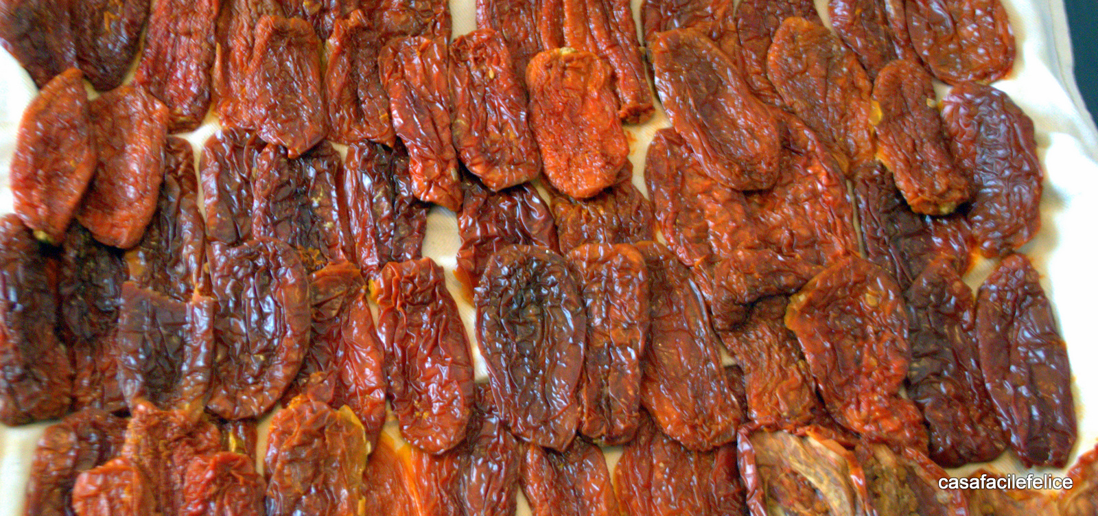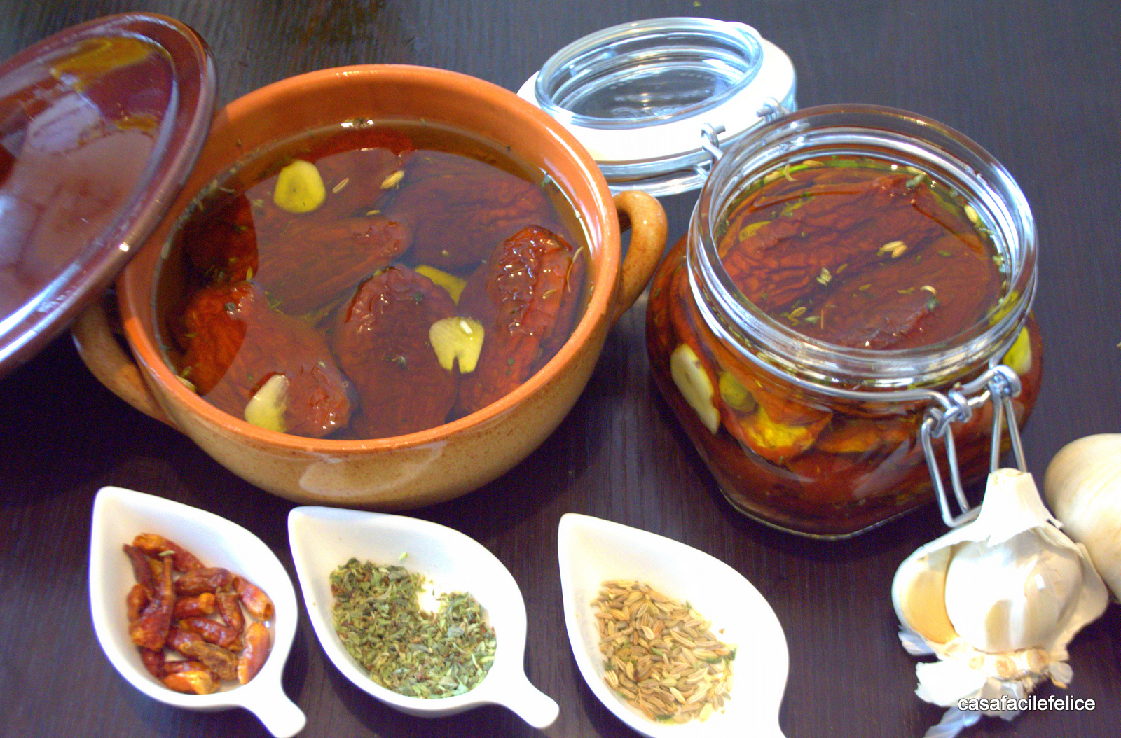 Mettete un filo d’olio nel vaso scelto, fate una fila di pomodori e profumate con aglio, origano e peperoncino se piace, versate un filo di olio e proseguite fino ad esaurimento degli ingredienti.