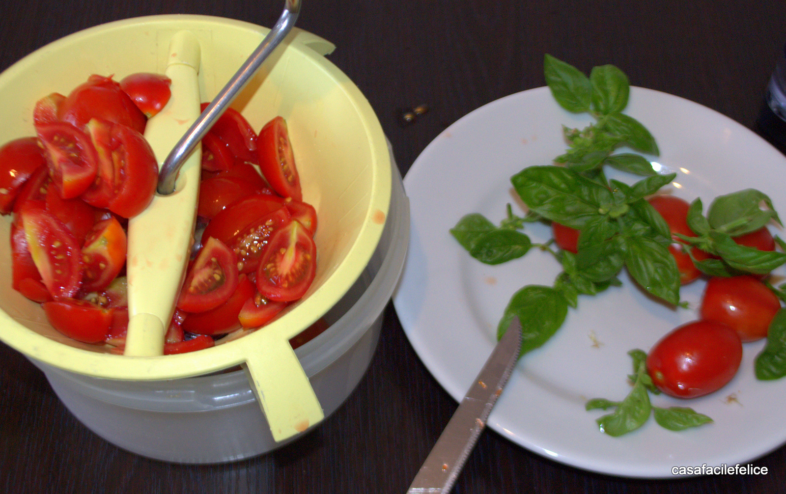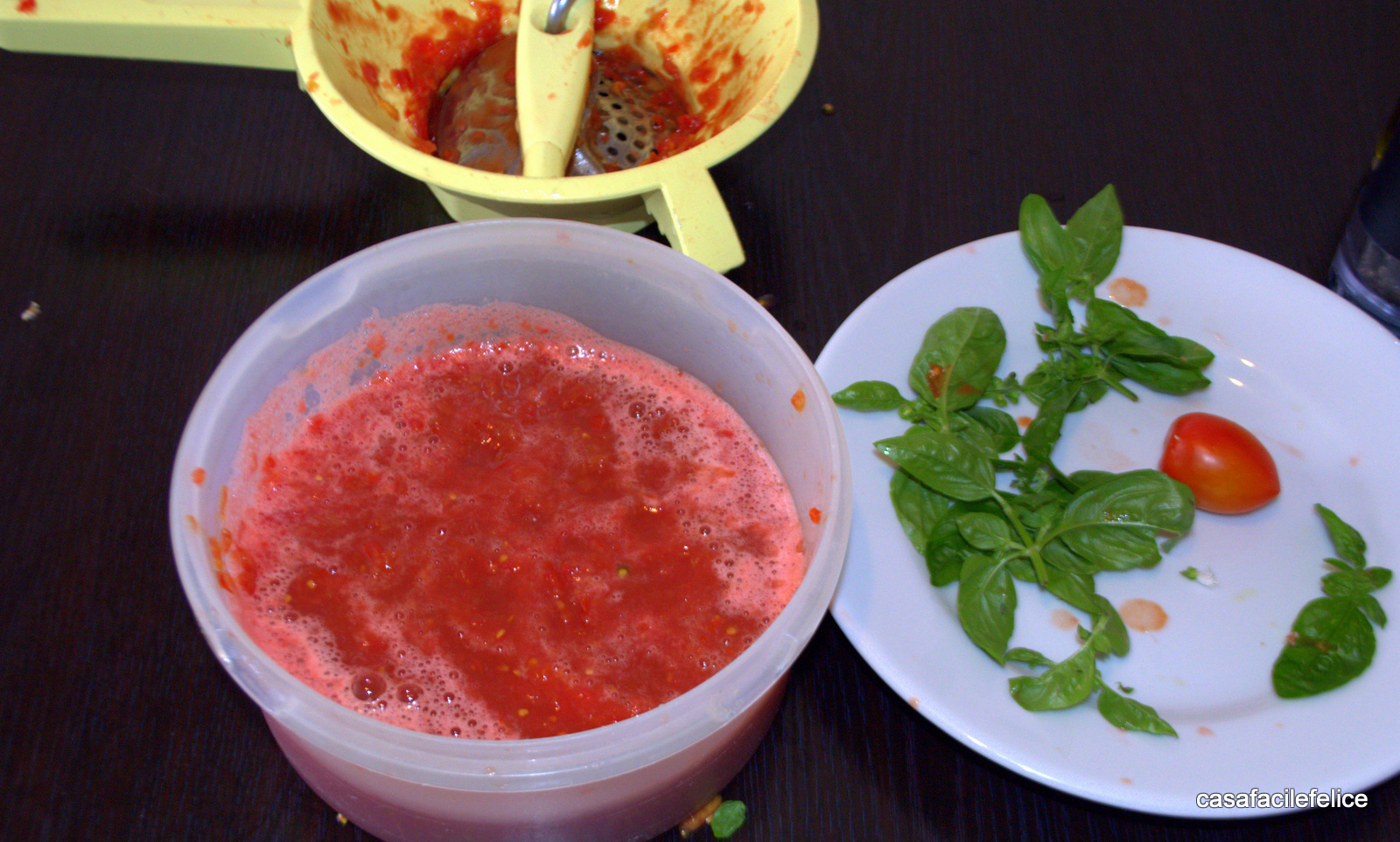 raccogliete il sugo in una scodella (a piacere potete togliere i semi spremendo i pomodori prima di passarli).