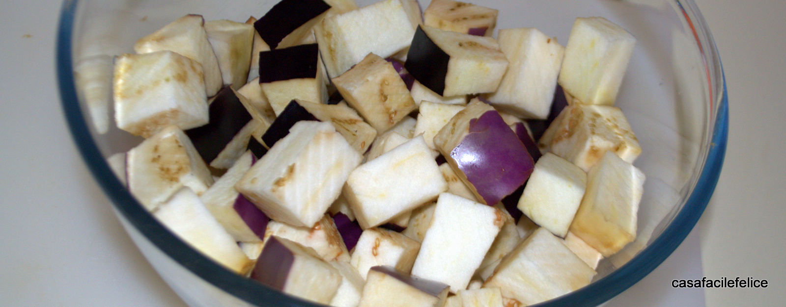 Lavate la melanzana e asciugatela bene, tagliatela in fette spesse e poi in  cubi piuttosto grossi.