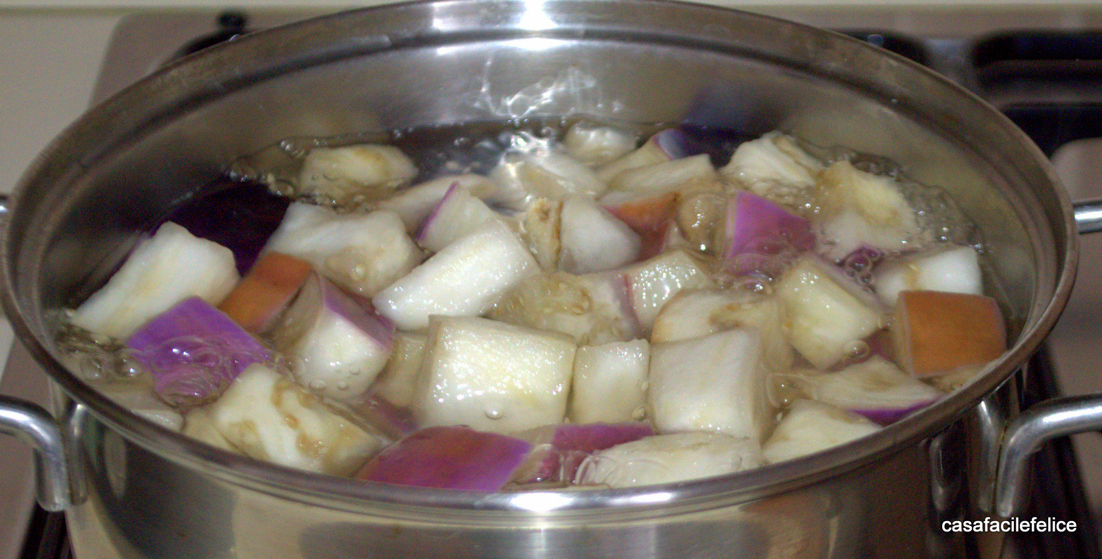 In una pentola capiente portate a bollore abbondante acqua e aceto, versate i cubi di melanzana e fate cuocere per otto o dieci minuti, dipende dalla grandezza dei cubi.