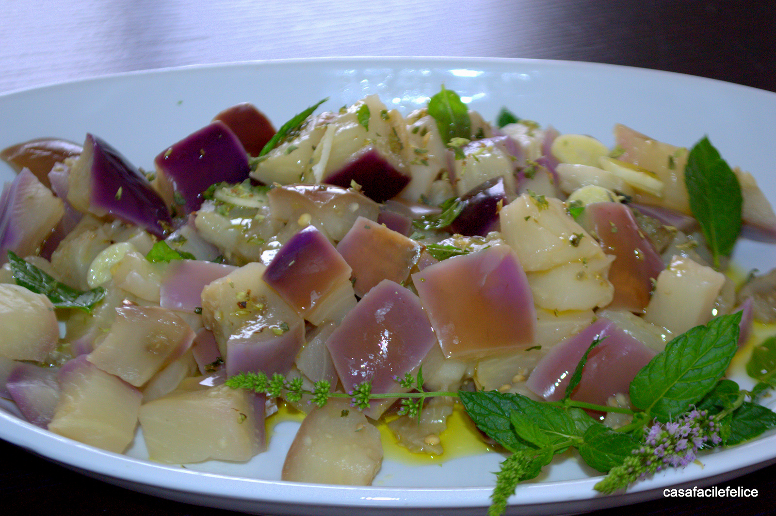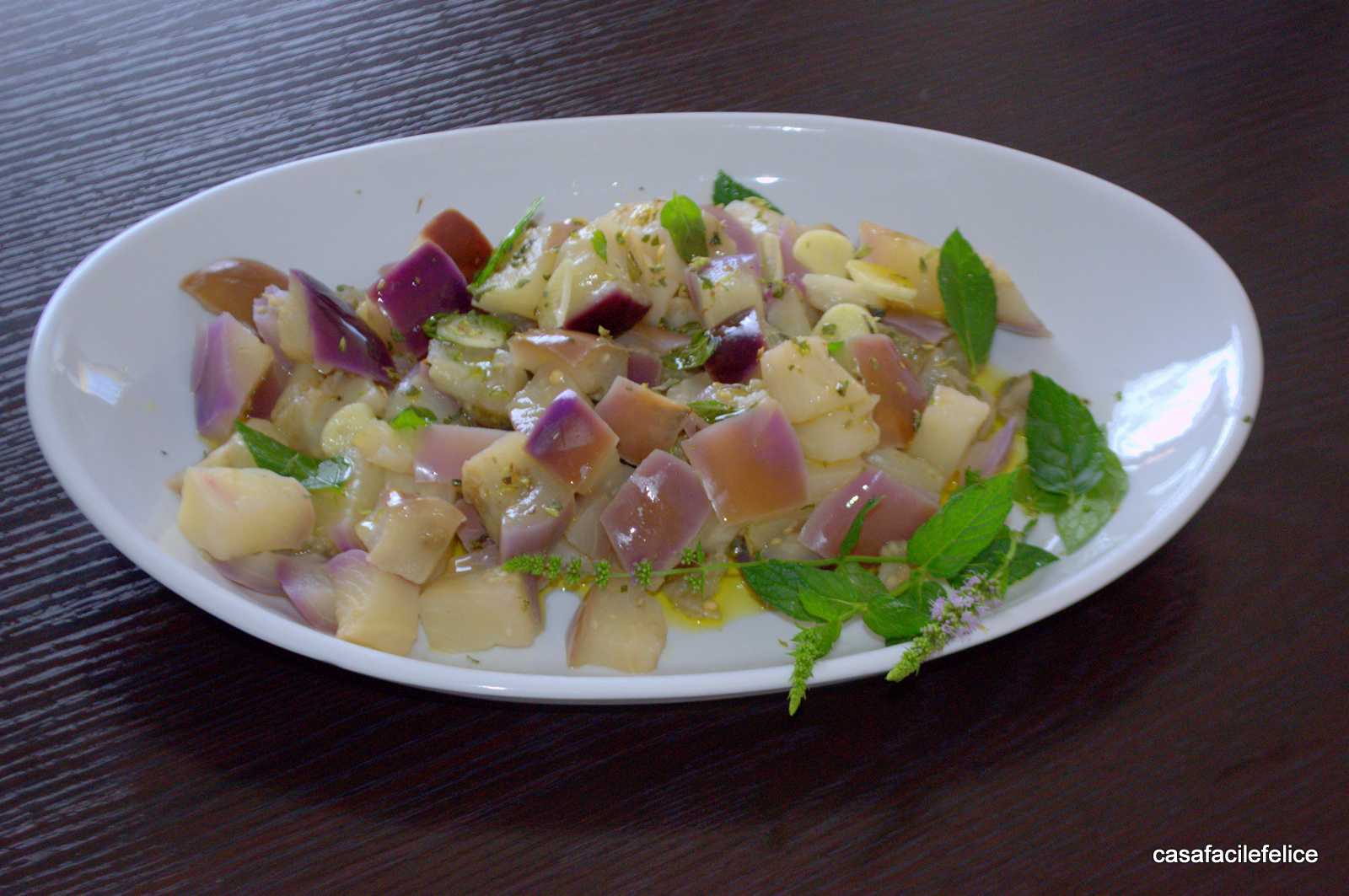 mettete nel piatto di portata e quando si saranno raffreddati, condite con fette di aglio, origano, un filo di olio extravergine e tanta menta fresca e profumata.