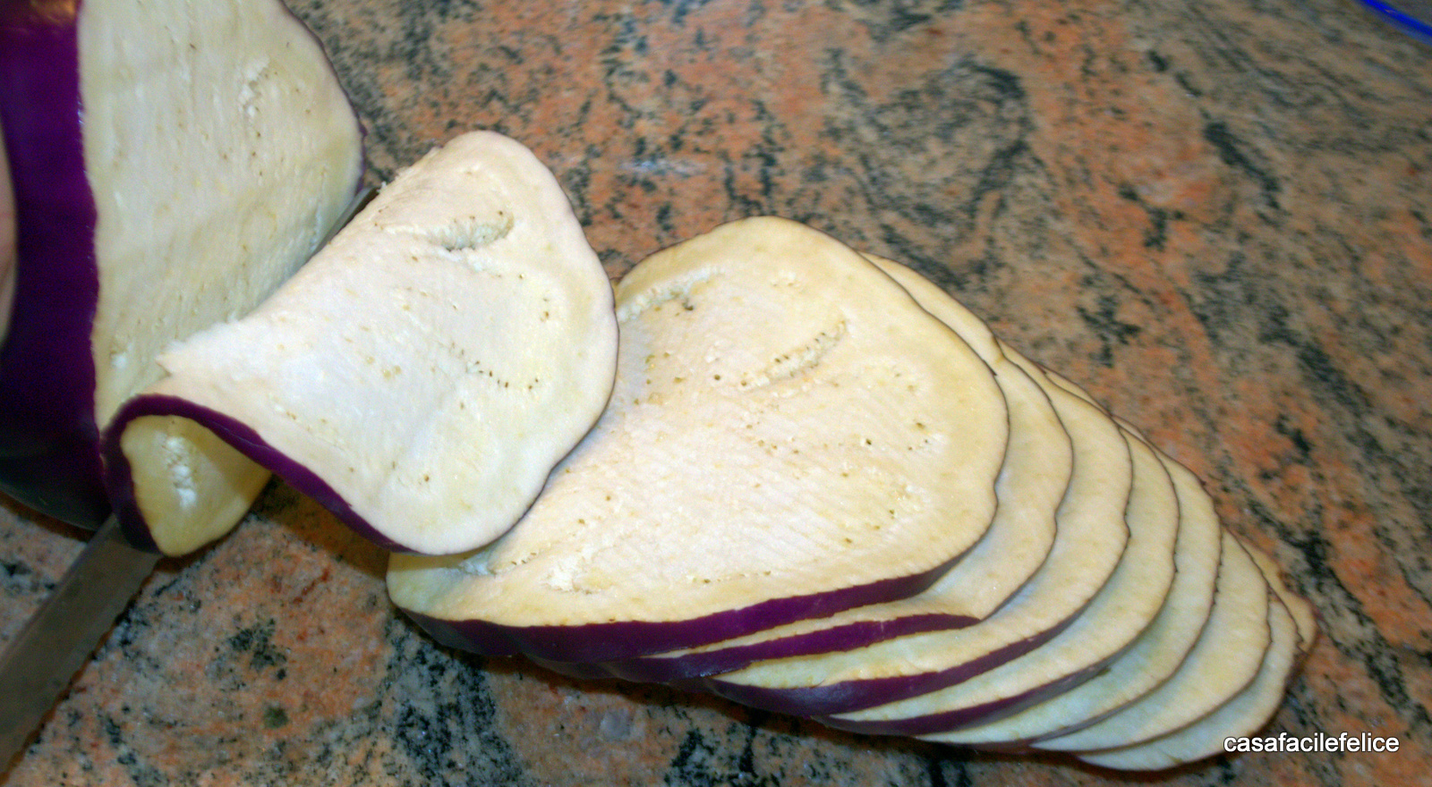 Intanto lavate, asciugate e tagliate a fette le melanzane o la melanzana se utilizzate quelle viola come nel video,