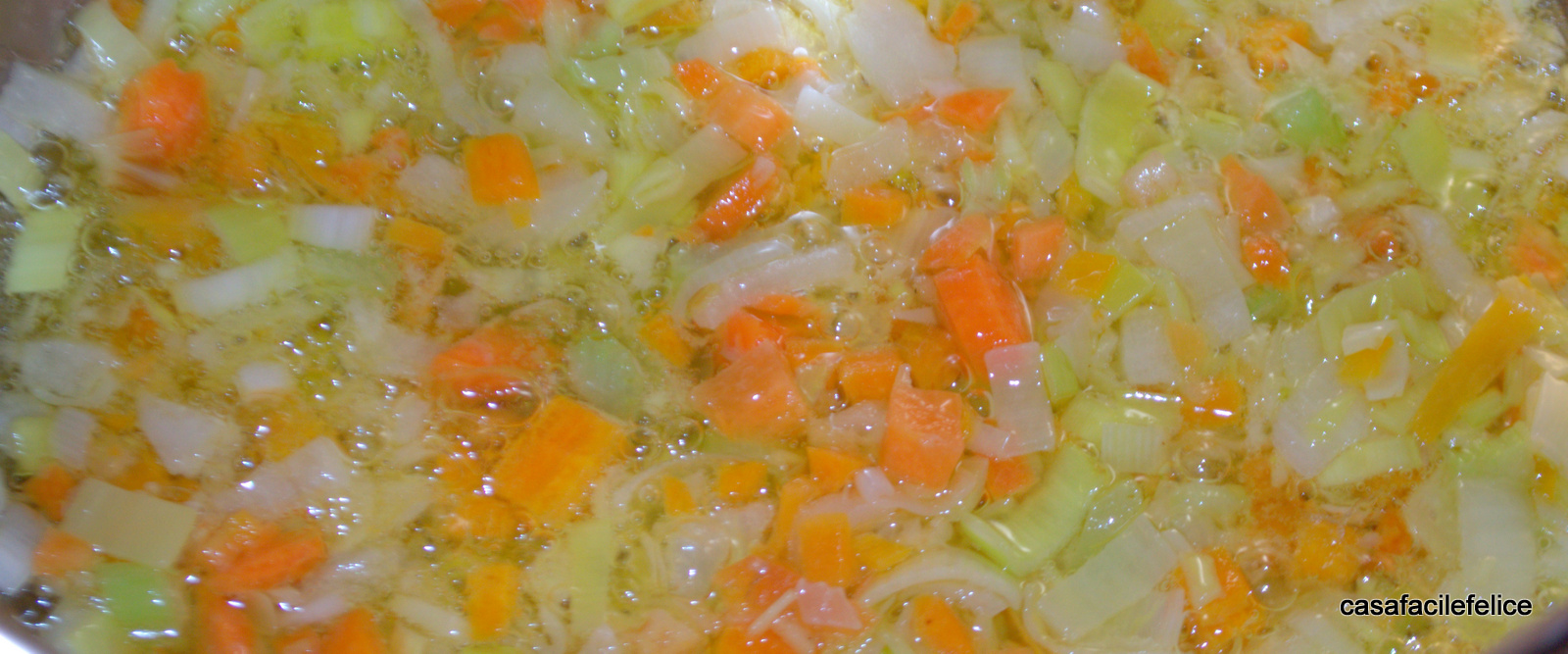 Fate sciogliere il burro a fuoco dolce in una pentola capiente, versate il trito di verdurine e fate appassire.