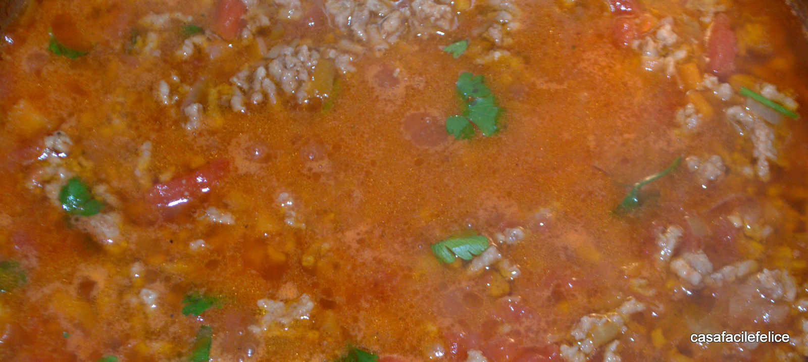 Aggiungete il brodo di carne e lasciate cuocere per cinque – dieci minuti. Versate anche i pomodori pelati tagliati a pezzetti con il loro sugo e mescolate bene.
