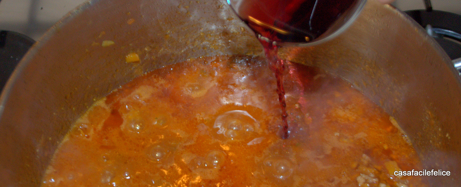 Aggiungete sale e pepe e lasciate cuocere coperto a fuoco dolce per mezzora o poco più. Quando sarà trascorso il tempo, aggiungete il vino rosso e fate cuocere ancora quindici minuti o finché non sarà evaporato del tutto.