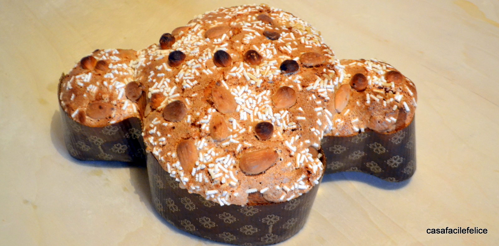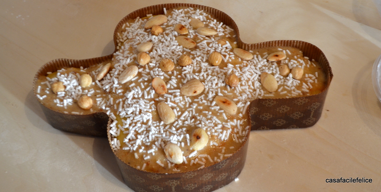 Quando sarà trascorso il tempo di lievitazione, coprite le colombe con la glassa, decorate con granella di zucchero, mandorle e nocciole.