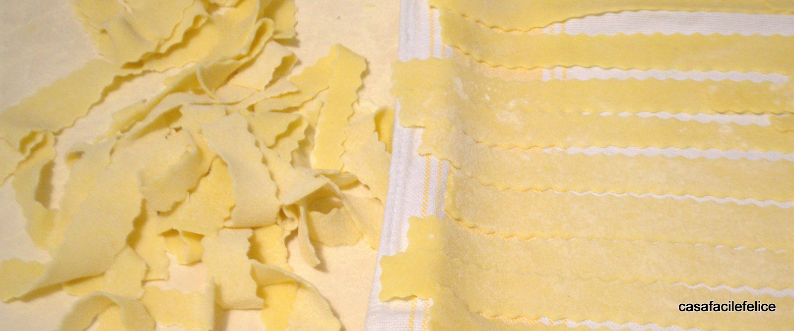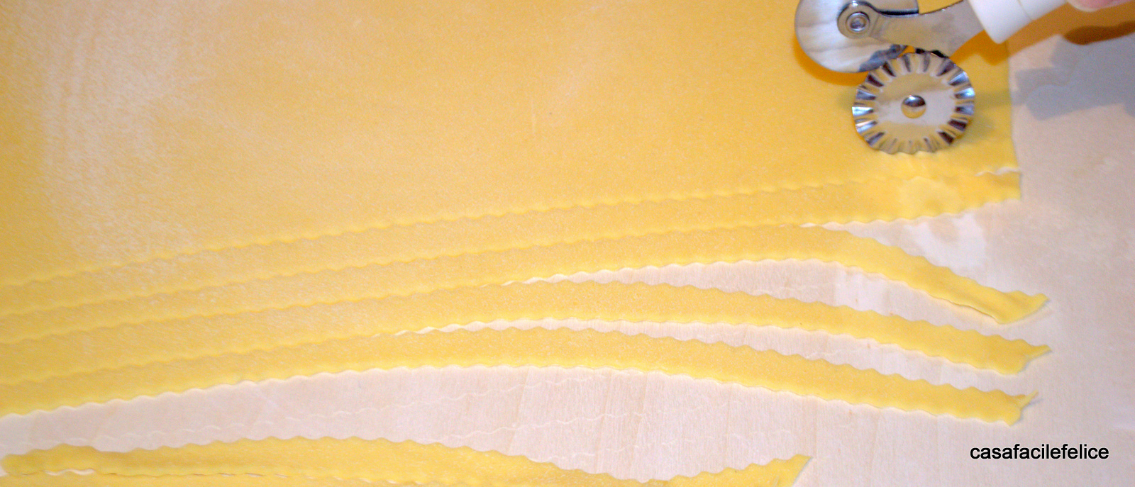 spolverate di semola rimacinata e ricavate tanti rettangoli dai quali ritaglierete le pappardelle larghe un centimetro utilizzando una rotella dentata.