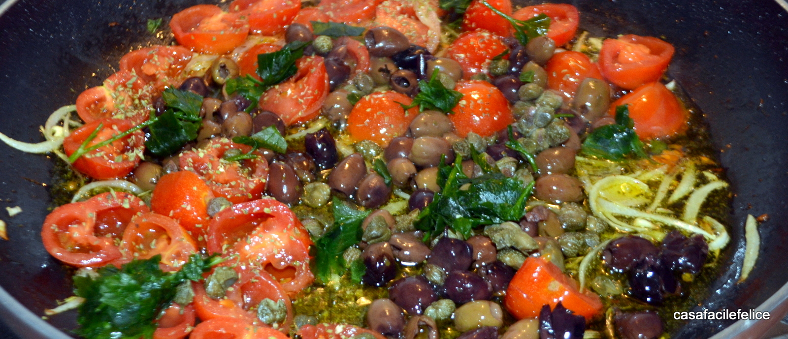 toglieteli e nella stessa padella fate appassire la cipolla tagliata sottile, il peperoncino, un paio di spicchi di aglio tagliati a pezzetti, i pomodorini tagliati a metà e privati dei semi, le olive e i capperi dissalati. Aggiungete una buona presa di origano, il prezzemolo tritato e lasciate andare un paio di minuti.