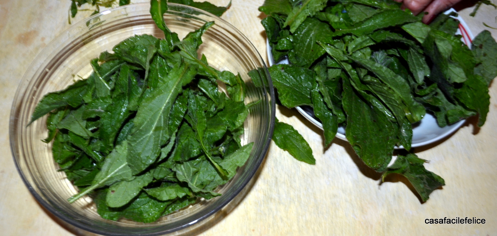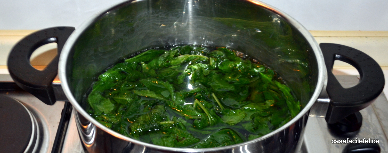 lavatele bene e scottatele 1 o 2 minuti in acqua bollente salata poi scolatele e fatele raffreddare velocemente in modo che mentengano il colore. Se necessario strizzate le foglie scottate in modo che risultino piuttosto asciutte.