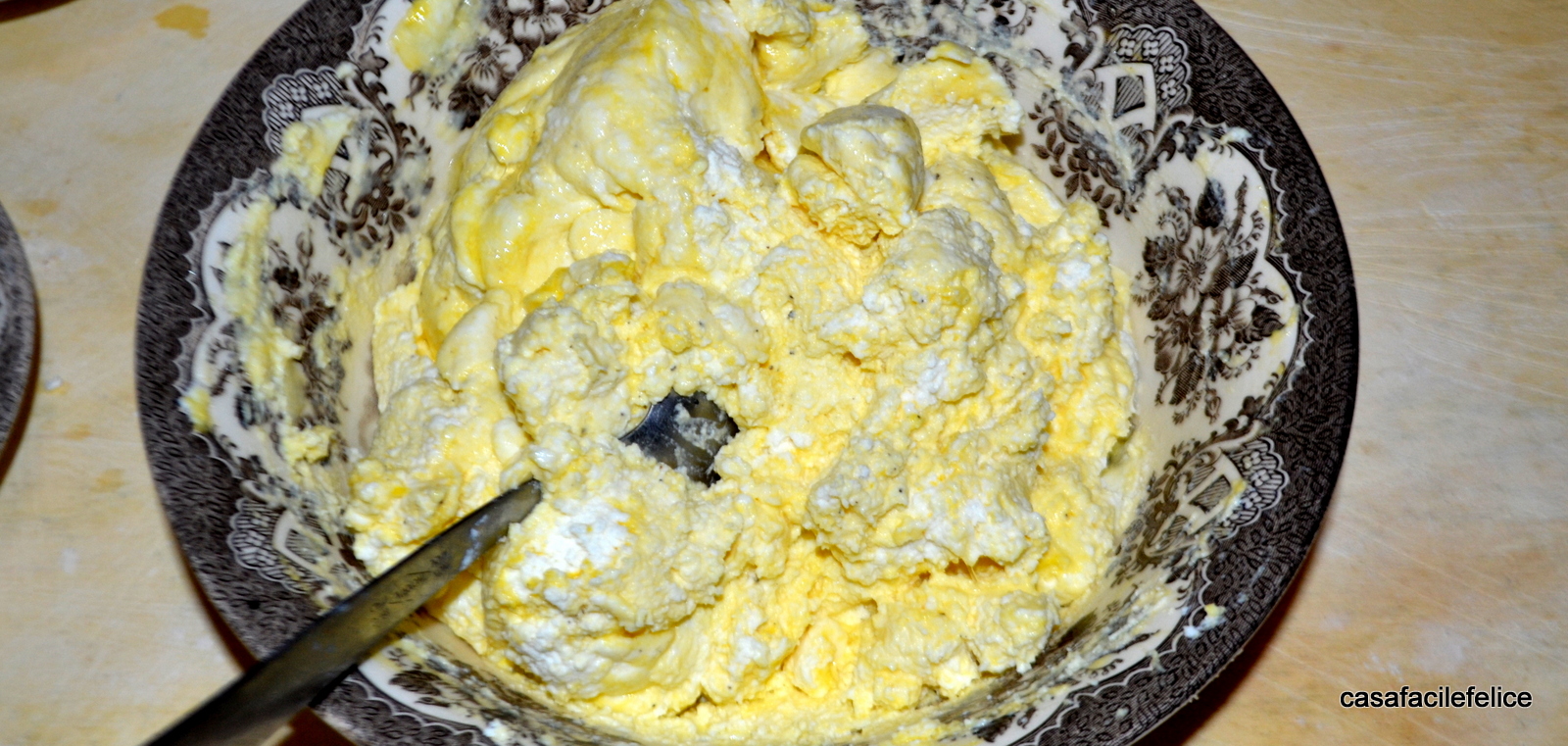 Passate la ricotta nello schiacciapatate, aggiungete sale pepe e formaggio grattugiato, aggiungete anche le uova e mescolate tutto accuratamente.
