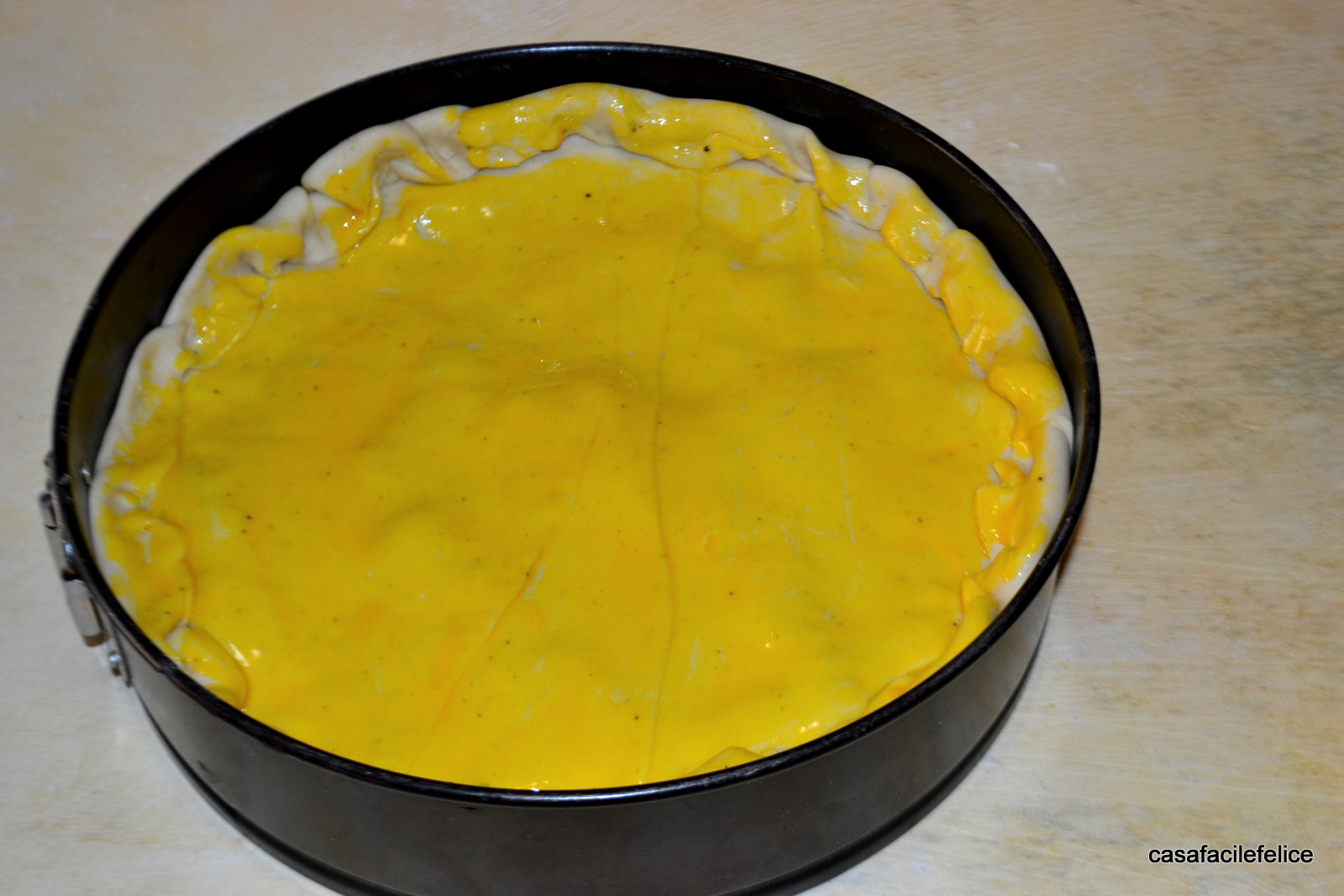 Foderate la tortiera e pungete il fondo con i rebbi di una forchetta, versate il ripieno e livellatelo.