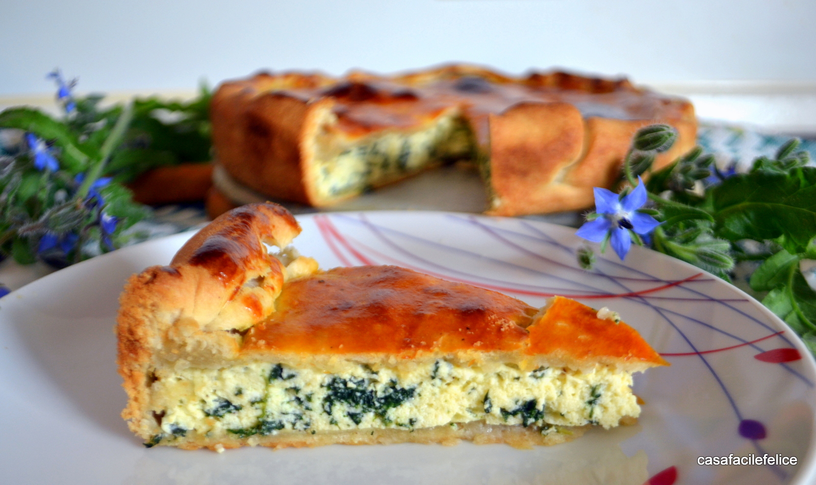 Con la pasta brisèe che potete trovare qui si possono preparare molte ricette dolci e salate, questa che viene proposta è una torta ripiena di ricotta e borragine, erbetta che si trova facilmente ai margini dei campi e nei terreni incolti e si riconosce per il classico fiore blu.