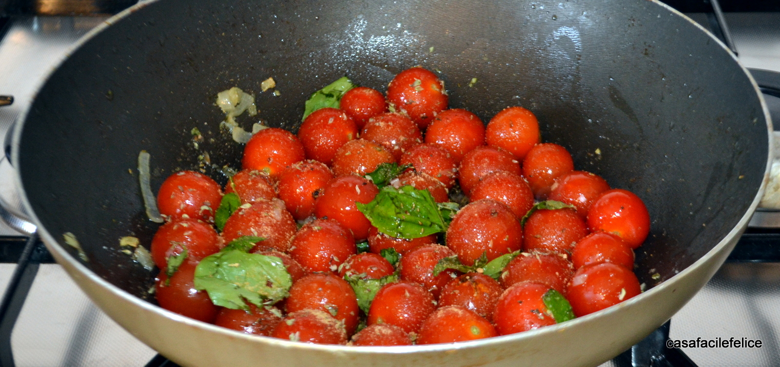 Fate cuocere coperto a fuoco medio per 7 – 10 minuti, il tempo dipende dalla maturazione dei pomodorini.