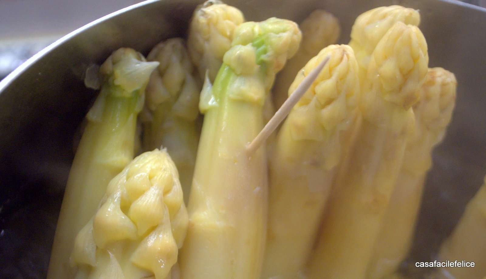 Quando sarà trascorso il tempo provate la cottura con uno stuzzicadenti, se entra facilmente l’asparago è cotto oppure mangiatene uno per essere certi che è di vostro gusto.